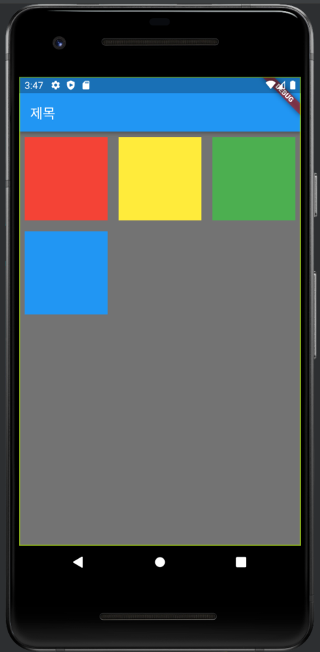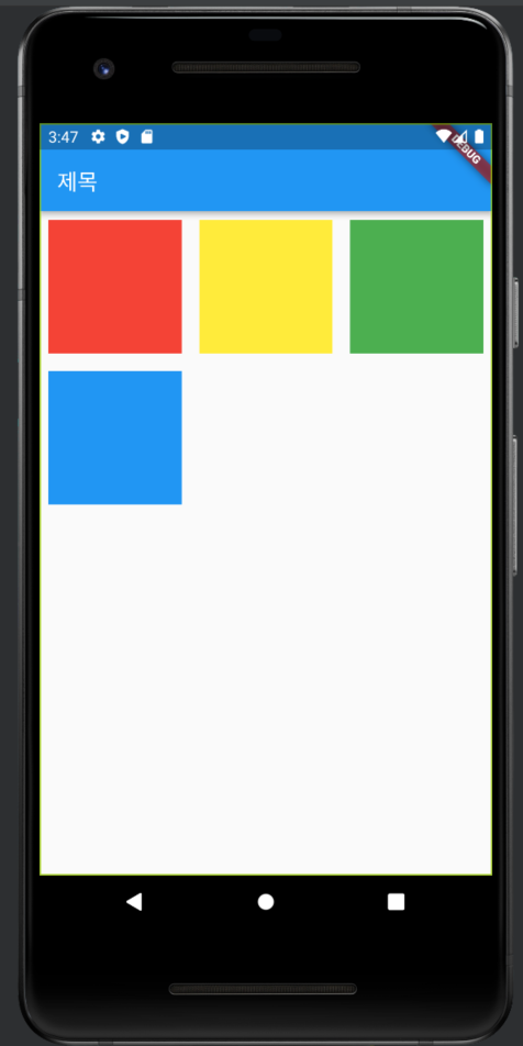 추가적으로, 따로 지정해주지 않은 gridView의 디폴트 사이즈는 전체 화면이다. 따라서 만약 GridView의 사이즈를 따로 지정하지 않고 crossAxisCount를 설정한다면, 전체 화면을 기준으로 구역이 나누어진다.