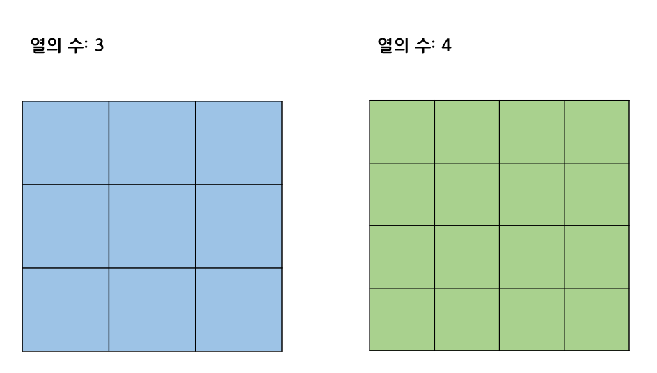 동일한 크기의 GridView 위젯을 각각 3열과 4열로 설정한다면, 자식에게 부여되는 공간의 크기는 각각 아래 그림과 같아지는 것이다.