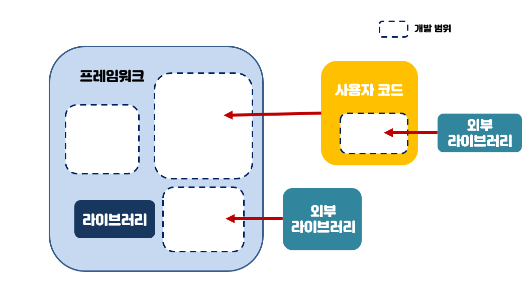 프레임워크는 개발의 전체적인 흐름과 방향을 잡고 있으며 개발자의 코드는 프레임워크 위에 얹을 수 있다. 따라서 개발자 코드는 프레임워크의 틀 안에서 수동적으로 동작하기 때문에 제어의 흐름은 프레임워크에 있다고 할 수 있다. 또한 기본 바퀴가 제공되는 것처럼 프레임워크 안에 라이브러리가 포함되어 제공될 수 있으며, 사용자는 프레임워크에서 제공된 라이브러리의 사용 여부 역시 선택 할 수 있다.