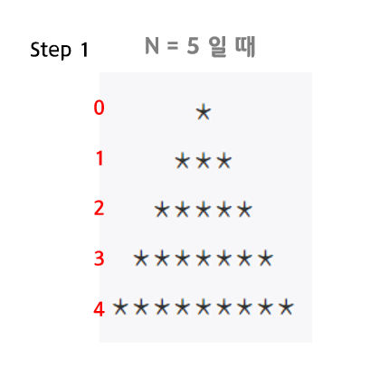 step 1. 만약 N이 5라고 한다면 출력해야하는 줄 i의 수는 0번 째 줄부터 4번 째 줄까지 총 다섯 줄이다.