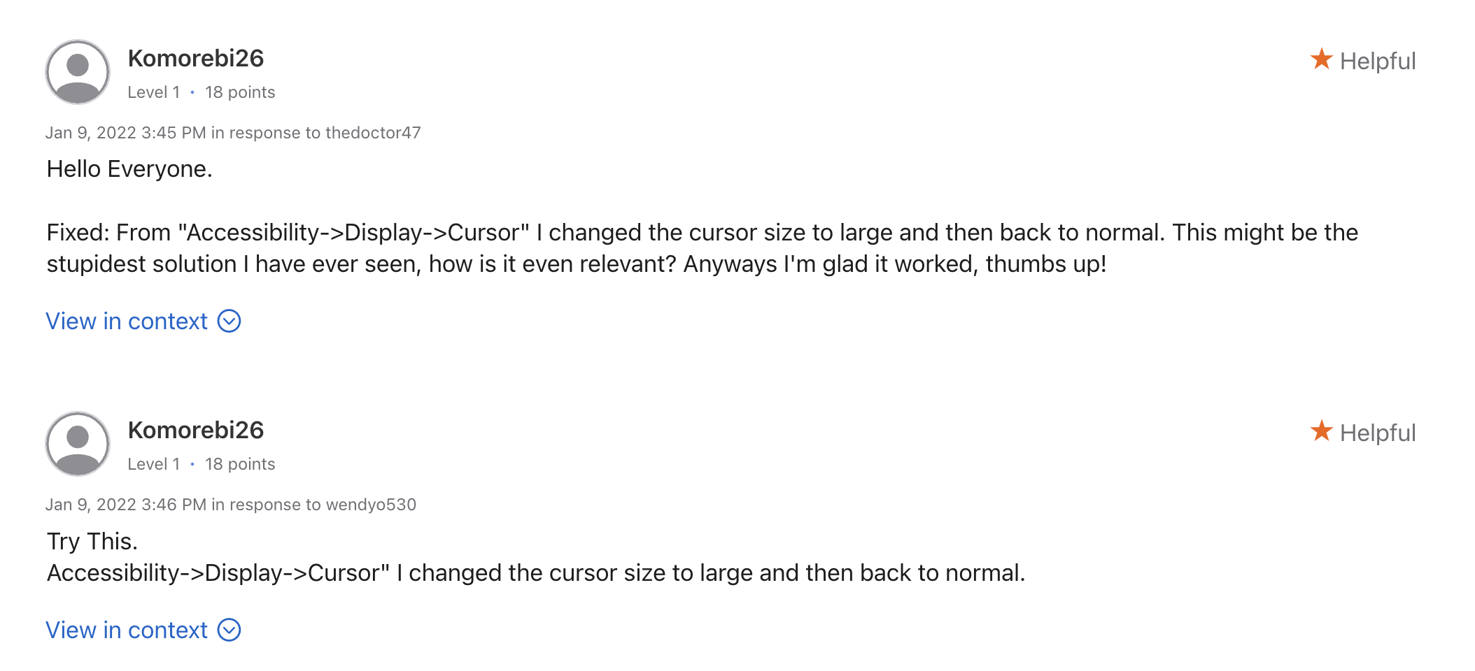- 접근성->디스플레이->커서" 커서 크기를 크게 변경했다가 다시 원래대로 되돌리세요.