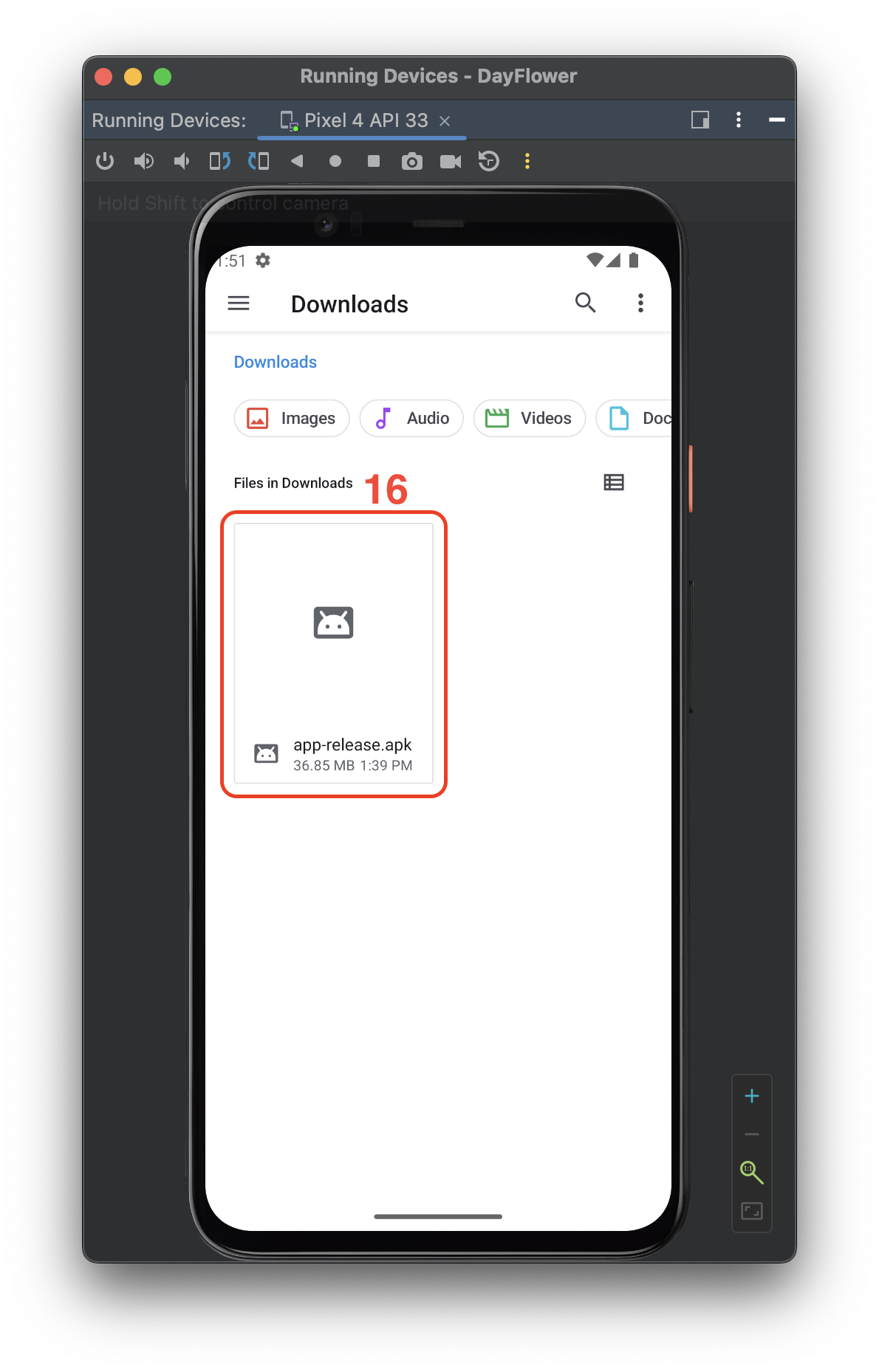 8. 에뮬레이터로 돌아와서 화면을 위로 스와이프하여 전체 어플리케이션 중 Files 선택