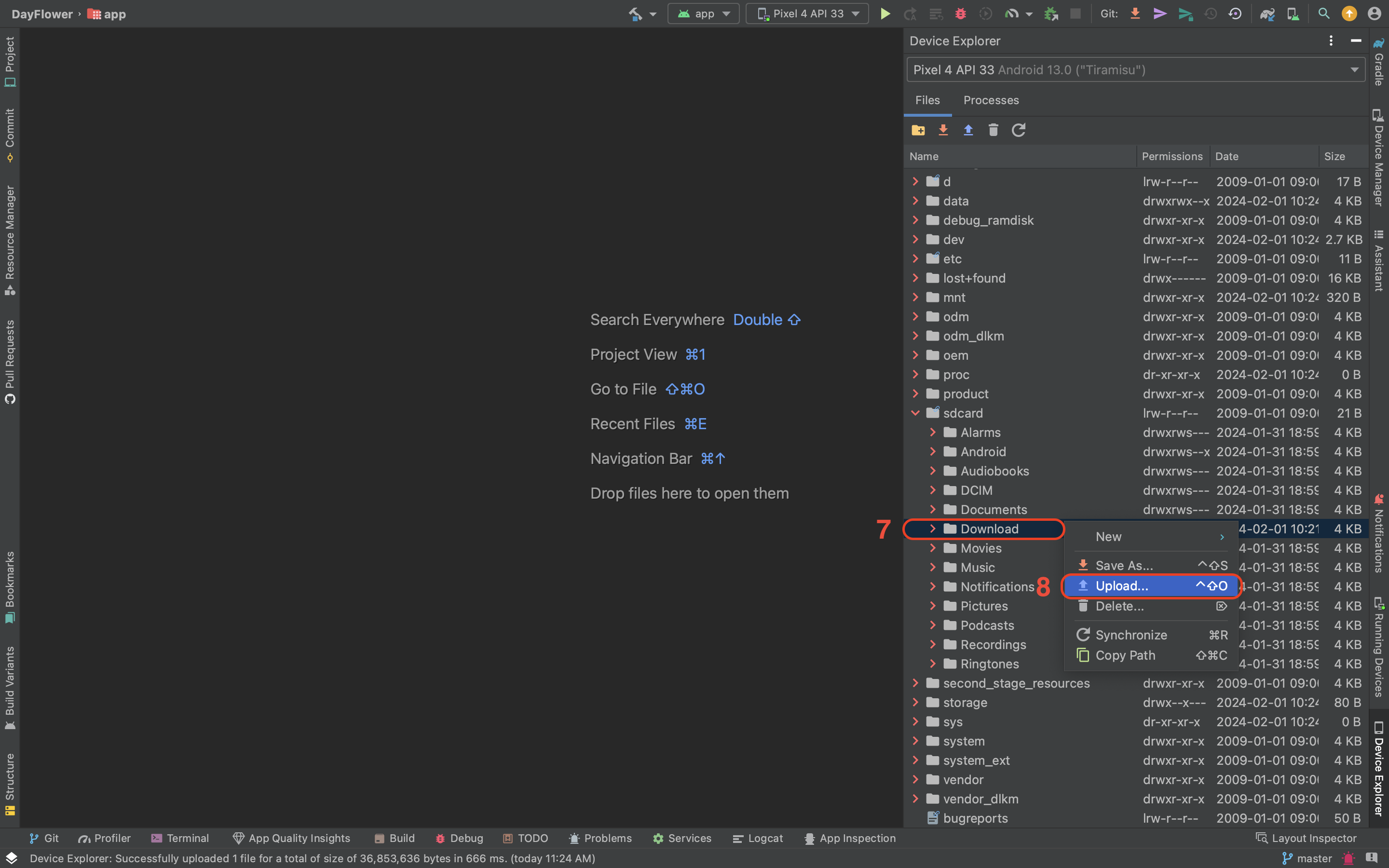 5. sdcard 내부의 Download 폴더 선택 후 마우스 우클릭으로 Upload 선택