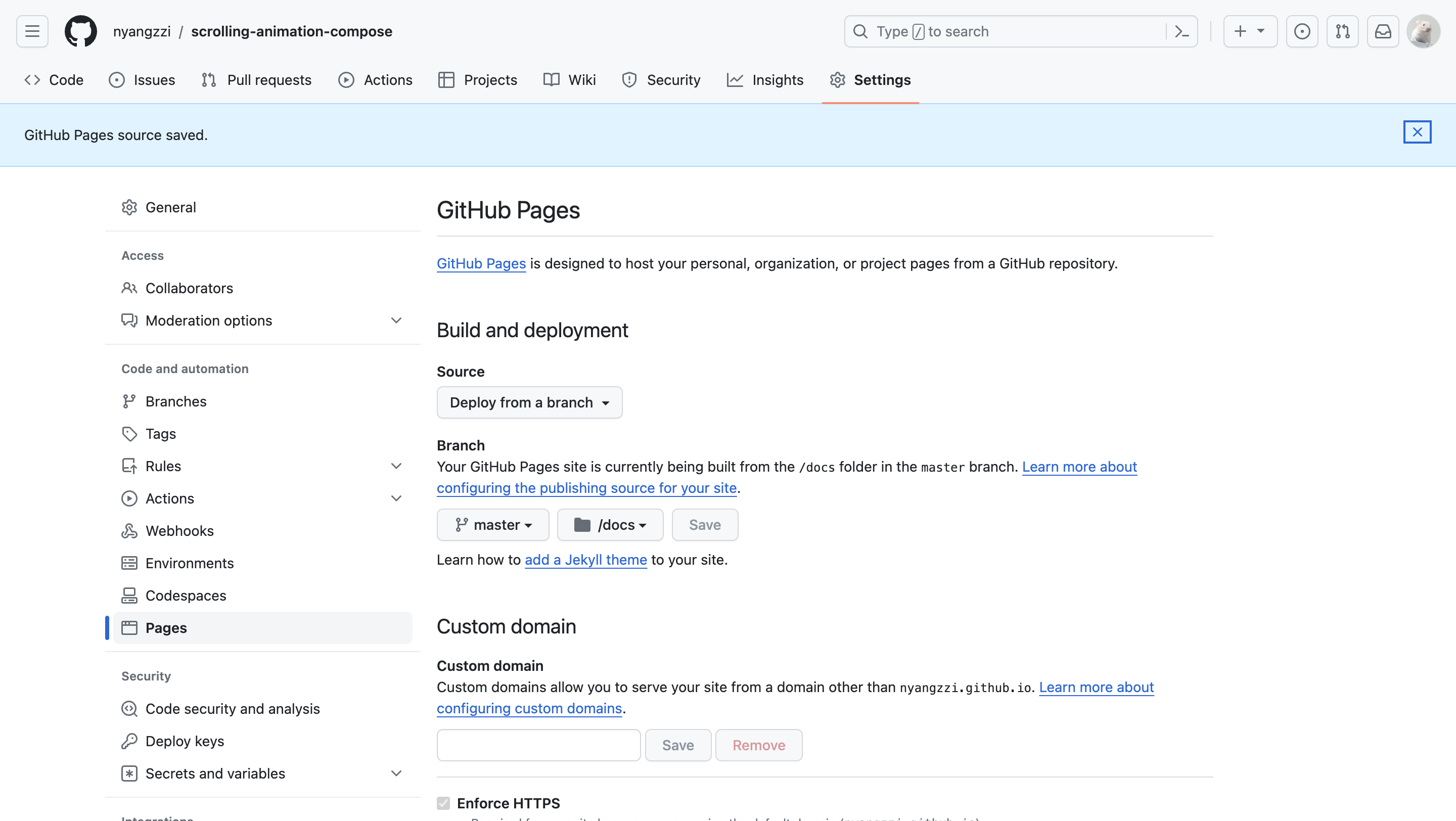 6. Branch의 /None/root 를 master(푸쉬한 브랜치)/docs로 변경 후 save