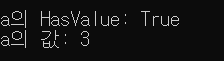 WriteLine("a의 HasValue: " + a.HasValue); //True