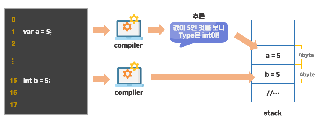 하지만 var 형식으로 선언 할 경우, 컴파일러가 알아서 타입을 추론해주기 때문에 프로그래머가 신경쓰지 않고 선언하는 것이 가능하다.