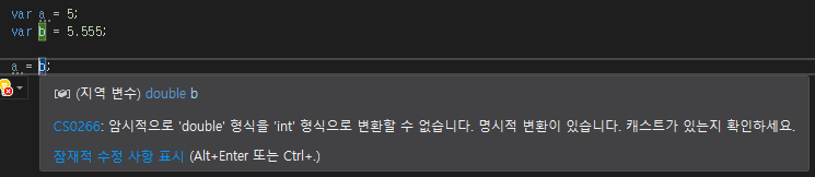 따라서 아래의 그림처럼 int형일 경우 4byte를, double형인 경우 8byte를 할당한다. 이후 int형인 a에 double형인 b의 값으로 덮어쓰려고 하면, a는 4byte의 영역을 할당 받았지만 b는 8byte의 영역이 필요하므로 덮어쓰는 것이 불가능하다.