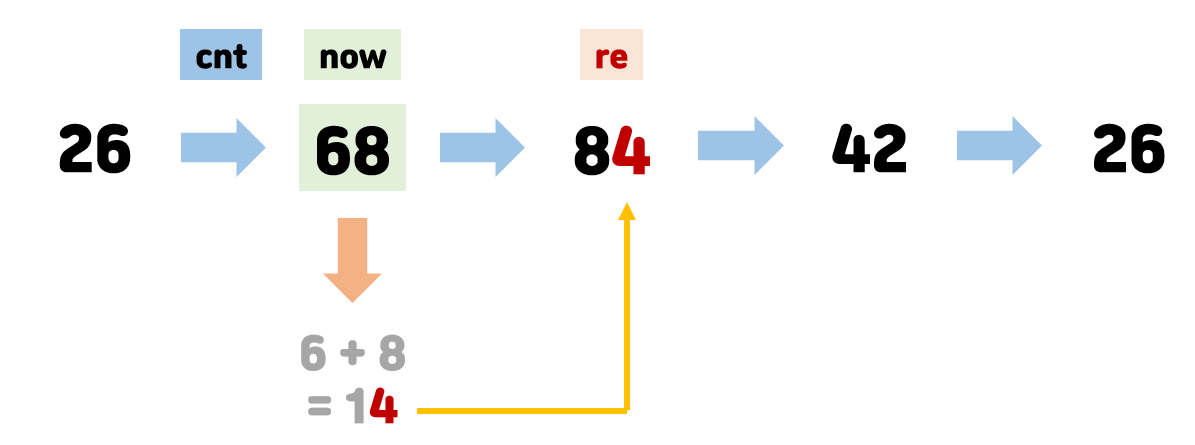 현재 새로운 수, 뒷자리에 추가할 수, 싸이클 횟수를 각각 선언해준다.
