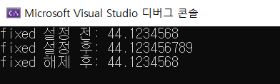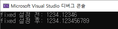 위의 결과를 확인하면 fixed 설정 전에는 전체의 9자리만을 출력하여 6번째 소수점부터는 출력되지 않았지만, fixed 설정 이후 소수점 아래 9자리 후가 모두 출력된 것을 확인 할 수 있다.