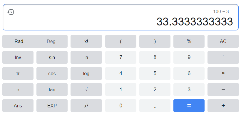 가령, 100 / 3 의 값은 3.333333... 으로 무한하다. 하지만 숫자를 무한히 출력할 수는 없으므로 계산기는 자신이 표시할 수 있는 수까지만 반올림하여 표시한다.