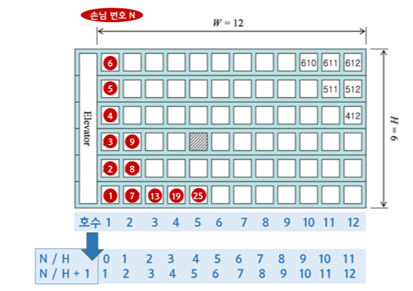 단, 나머지가 0일 경우 가장 높은 방 H층을 배정 받게 된다.