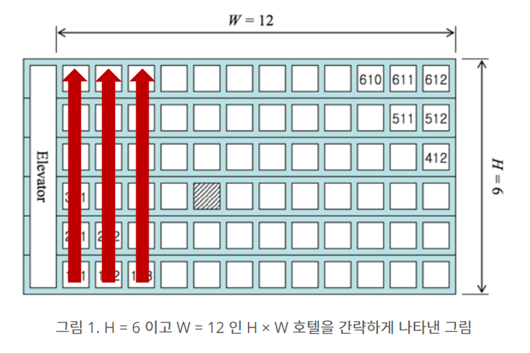 먼저, 층수의 경우 손님 번호 N 을 높이 H로 나눈 것의 나머지가 된다.