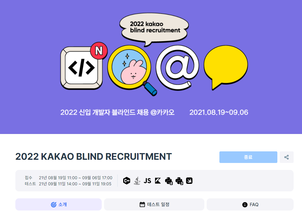 요즘 퇴근하고 집에 오면 누워서 뒹굴거리는 거 밖에 하지 않는 것 같아서 동기부여 할 겸 카카오에 코딩 테스트에 참여했다. 그냥 이메일만 적으면 누구나 다 응시 할 수 있기 때문에 신청했지 아마 지원서도 내라고 했으면 절대 안 했을 거다.