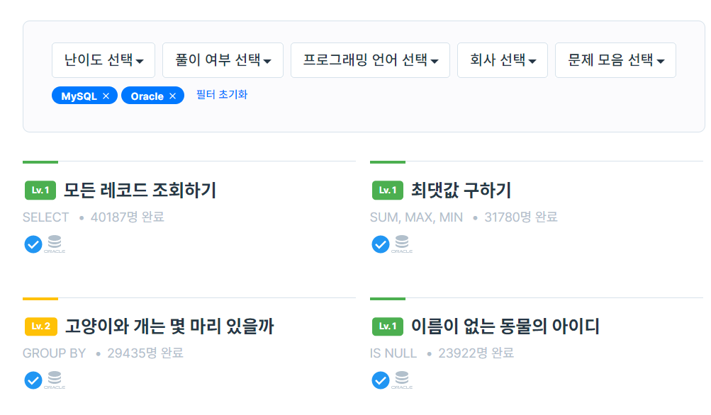 취업 준비를 하면서 얻었던 꿀팁인데, 백문이불여일견이라고 확실히 직접 해보는 게 기억에 훨씬 잘 남았기 때문에 복습을 할 때도 꼭 프로그래머스에서 모든 문제를 한 번씩 풀어보고 갔다. 아래 링크에서 프로그래밍 언어 선택 - MYSQL 혹은 ORACLE로 선택하면 SQL 관련 문제를 풀어볼 수 있는데, 따로 DBMS를 설치하지 않고도 기본 SELECT부터 JOIN까지 풀어볼 수 있기 때문에 꼭 정보처리기사가 아니더라도 SQL SELECT 관련해서 복습할 일이 있다면 이용해보는 것을 추천한다.