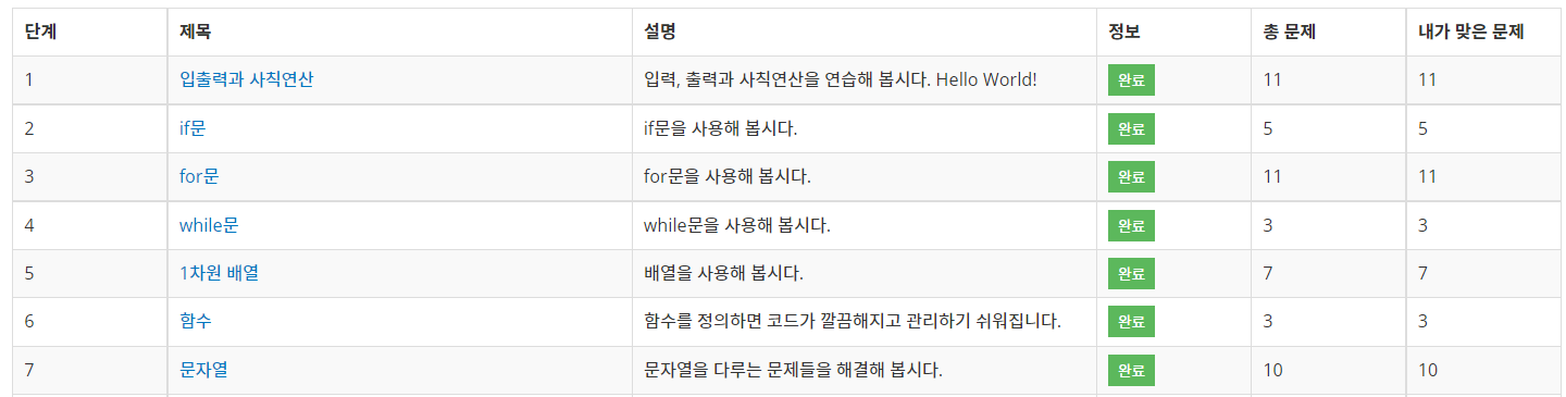 단계별은 @jh05013님이 관리하고 계십니다. 단계제목설명정보총 문제내가 맞은 문제1입출력과 사칙연산입력, 출력과 사칙연산을 연습해 봅시다. Hello World!112if문if문을 사용해 봅시다.53for문for문을
