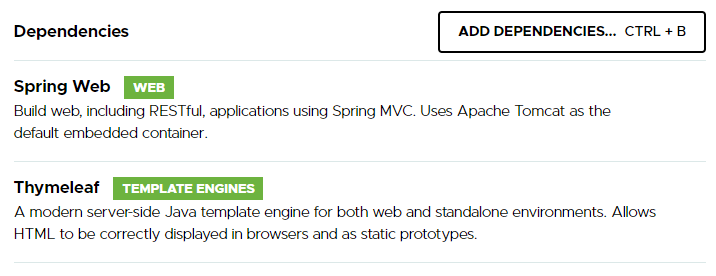 ADD DEPENDEMCIES... 를 클릭하여 Spring Web과 Thymeleaf* 를 추가한다.