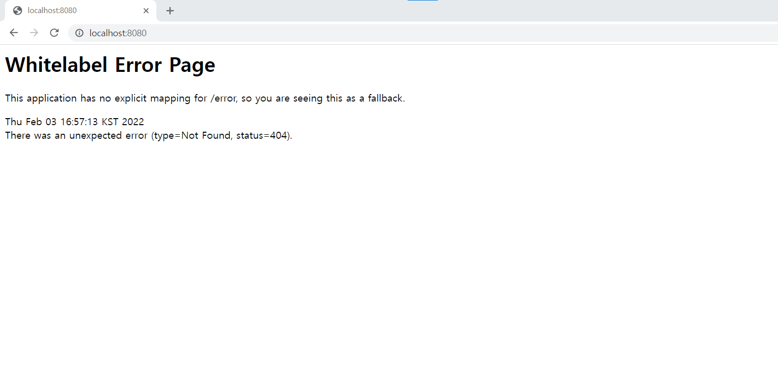 4. localhost:8080 에 접속하여 다음과 같은 에러 페이지가 뜨는 것이 정상