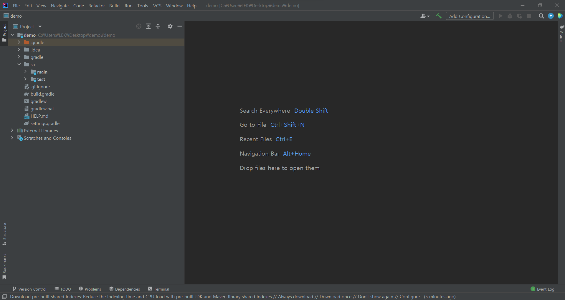 처음 인텔리제이를 사용하는 경우 설정을 위해 여러 라이브러리 등을 다양하게 다운 받기 때문에 반드시 네트워크에 연결되어 있어야하며, 컴퓨터 사양에 따라 일정 시간 소요될 수 있으니 세팅이 완료될 때까지 기다리면 된다.