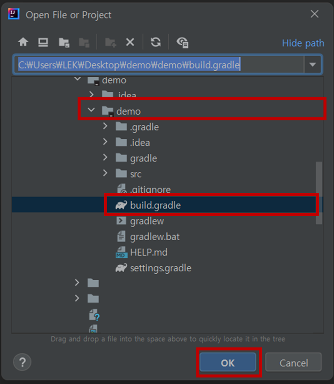 3. 앞서 압축해제한 파일의 build.gradle 선택 후 OK