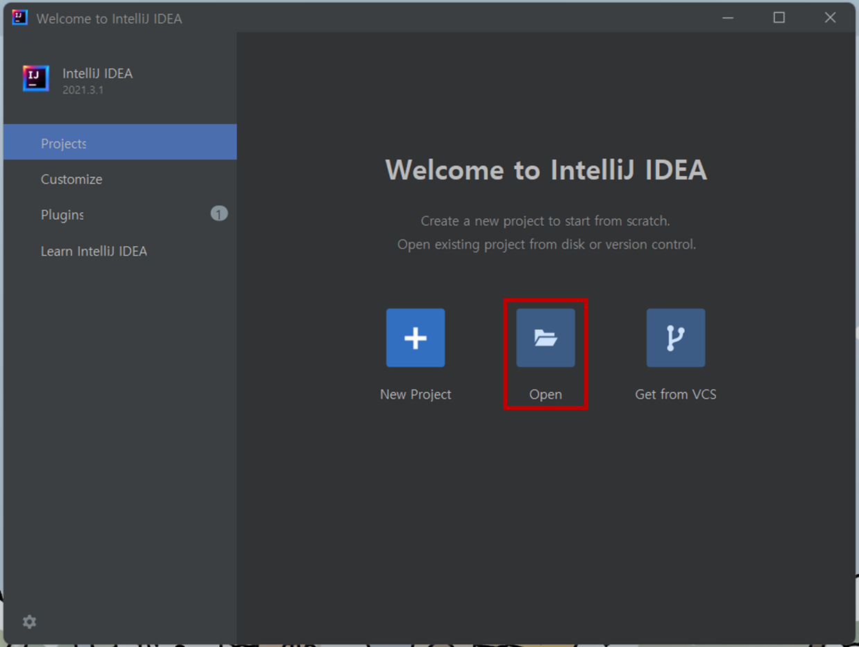 2. IntelliJ를 실행한 뒤 Open 버튼 클릭