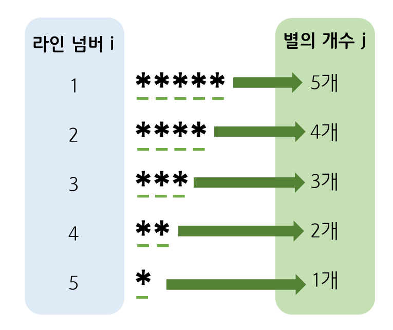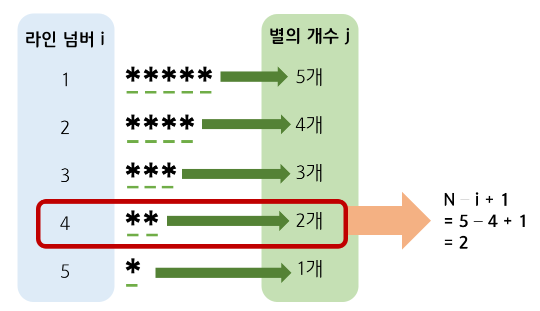 예를 들어 입력 N이 5일 때 4번째 라인의 별의 수는 N - i + 1 = 5 - 4 + 1 = 2가 되는 것을 알 수 있다.