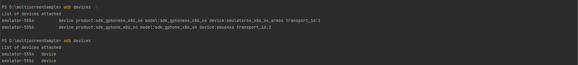 *사용 가능한 여러 기기가 있지만 에뮬레이터가 하나뿐인 경우에는 -e 옵션을 사용하여 에뮬레이터에 명령어를 전송